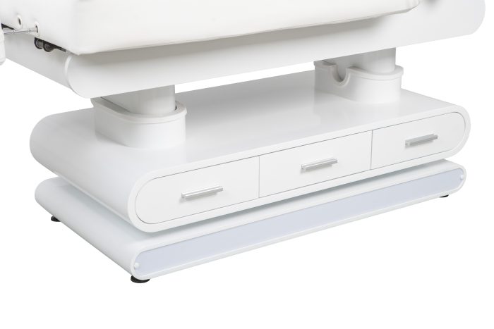 Base robusta de madera lacada en blanco con LED multicolor y seis cajones integrados (tres en cada lado) para almacenar productos.
