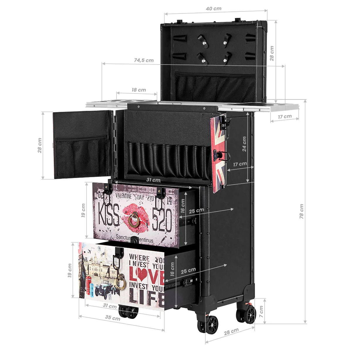 Los estantes extraíbles con asas y lugares para accesorios, cajones, compartimentos y bolsillos especiales para almacenar productos y herramientas de barbería, peluqueria, maquilladores, etc. facilitan la limpieza de su área de trabajo y mejoran significativamente la organización del espacio.