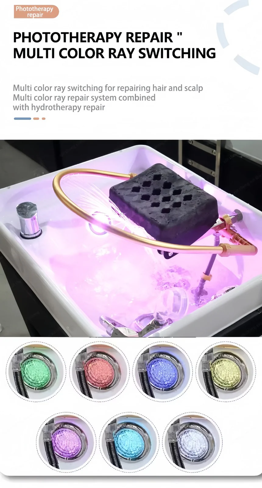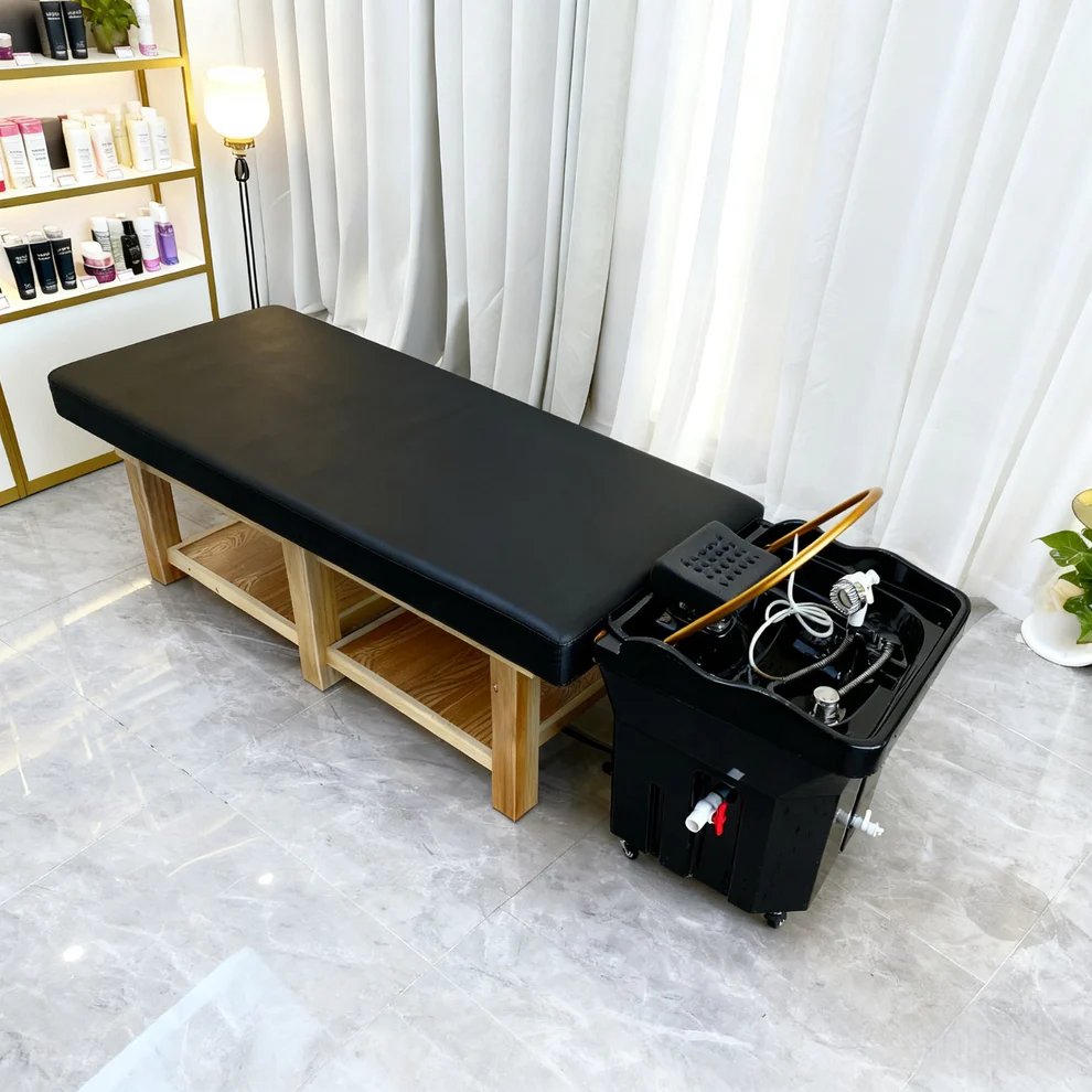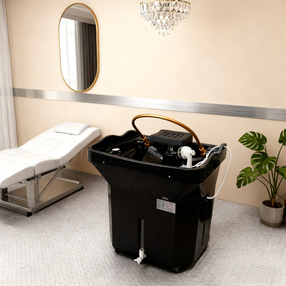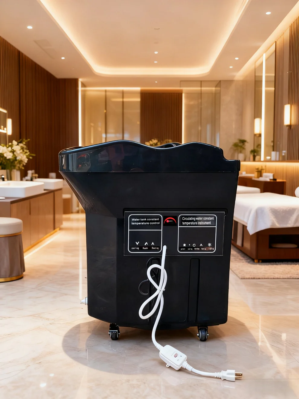 - Panel de control para ajustar la temperatura del agua del lavabo (bomba de agua caliente y filtrada). Esto garantiza una temperatura constante durante el tratamiento.