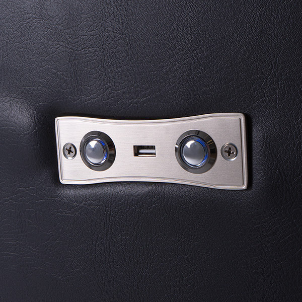 Lavacabezas de diseño elegante y funcional, tapizado negro, con sistema de reclinación eléctrica y puerto USB integrado.