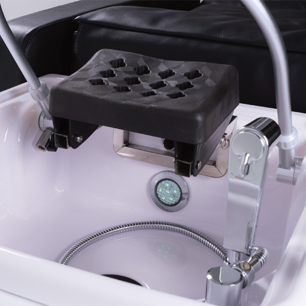 Lavacabezas de diseño elegante y funcional, tapizado en serie negro, con sistema de reclinación eléctrica y puerto USB integrado.