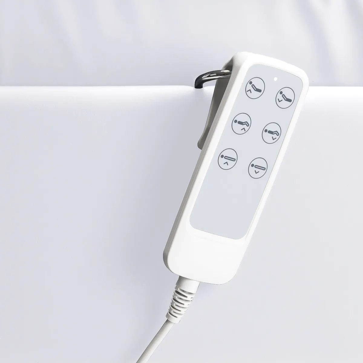 Equipado con 3 actuadores controlados por control remoto mediante cable, permite un ajuste suave en tres planos: Altura y ángulos ajustables del respaldo y el reposapiés.